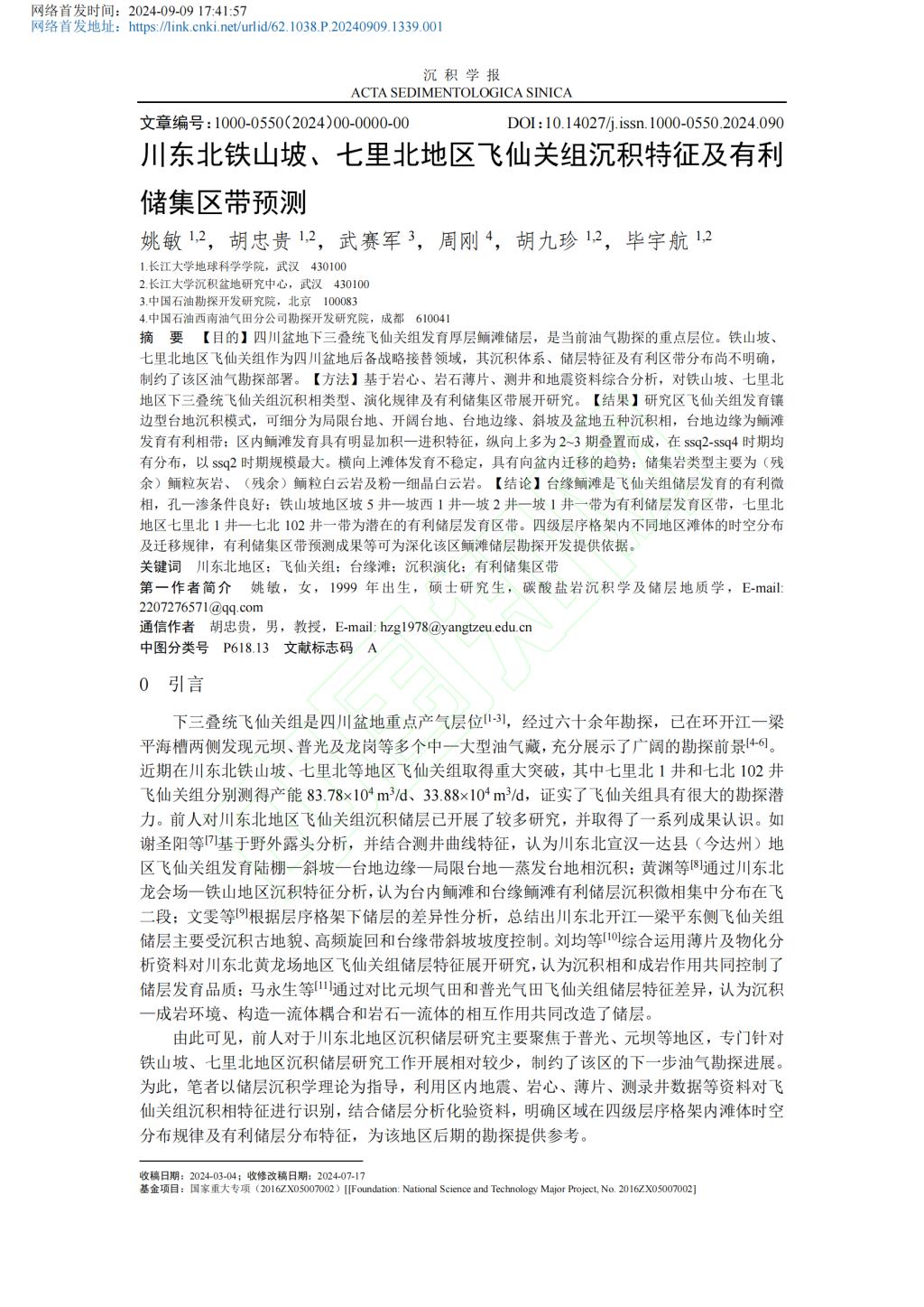 2138cn太阳集团22级硕士研究生姚敏在期刊《沉积学报》上发表题为“川东北铁山坡、七里北地区飞仙关组沉积特征及有利储集区带预测”的研究论文。长江大学2138cn太阳集团为论文第一署名单位,硕士研究生姚敏为论文第一作者,其导师胡忠贵教授为该文通讯作者。