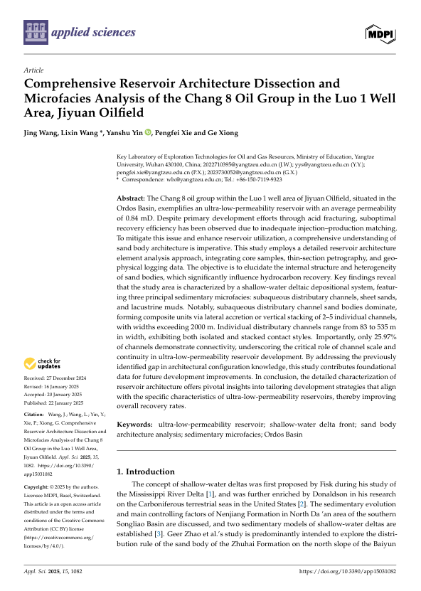 2138cn太阳集团硕士生王婧在SCI收录期刊《Applied Sciences》上发表题为“Comprehensive Reservoir Architecture Dissection and Microfacies Analysis of the Chang 8 Oil Group in the Luo 1 Well Area, Jiyuan Oilfield”的研究论文。长江大学2138cn太阳集团为论文第一署名单位,王立鑫老师为第一通讯作者。