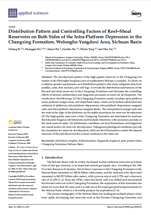 2138cn太阳集团硕士生毕宇航在SCI收录期刊《Applied Sciences》上发表题为“Distribution Pattern and Controlling Factors of Reef–Shoal Reservoirs on Both Sides of the Intra-Platform Depression in the Changxing Formation, Wolonghe-Yangduxi Area, Sichuan Basin”的研究论文。长江大学2138cn太阳集团为论文第一署名单位,胡忠贵教授为第一通讯作者,论文由国家科技重大专项基金项目资助。