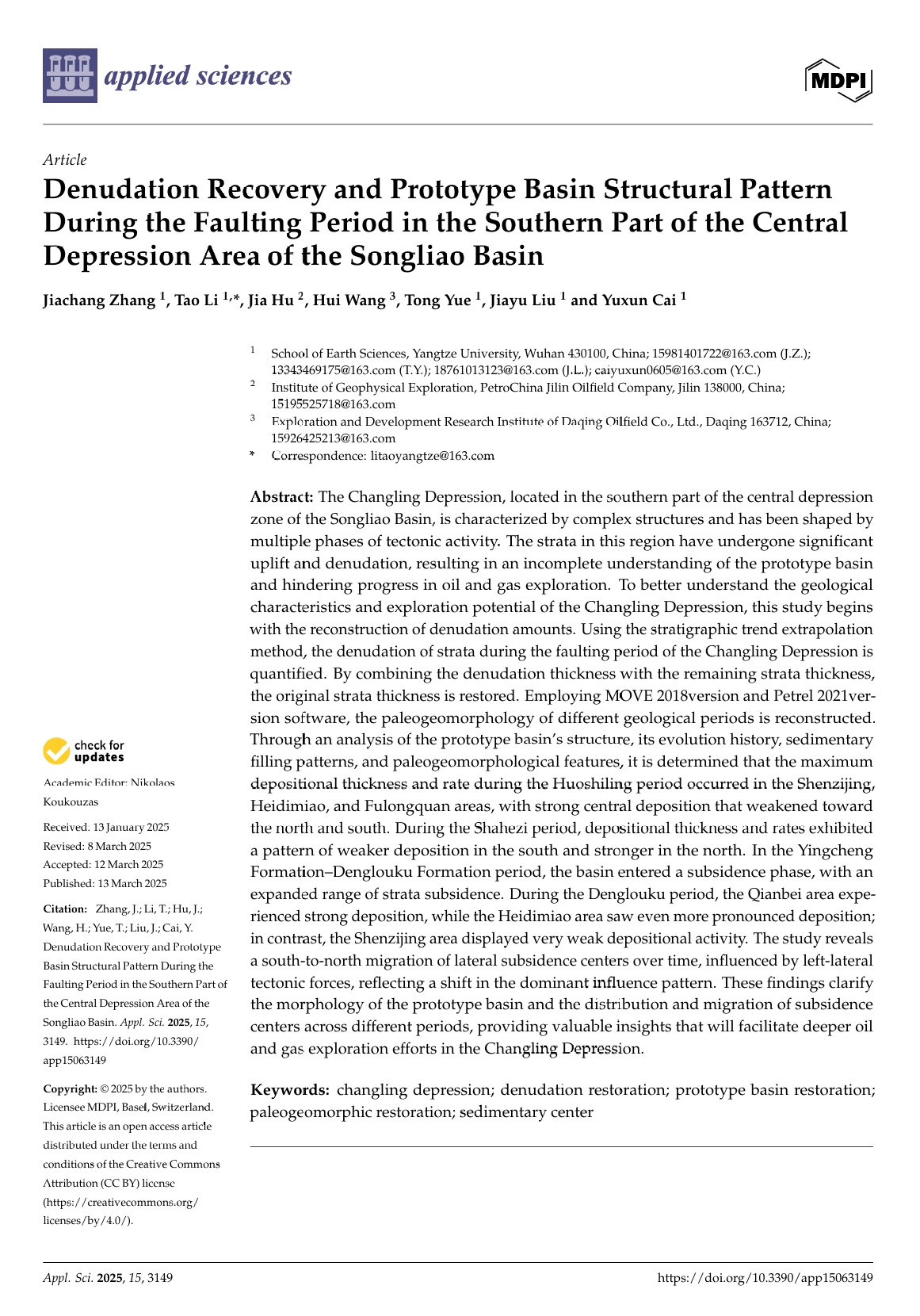 2138cn太阳集团硕士研究生张珈畅在《applied sciences》上发表题目为“Denudation Recovery and Prototype Basin Structural Pattern During the Faulting Period in the Southern Part of the Central Depression Area of the Songliao Basin”的研究论文。长江大学2138cn太阳集团为论文第一署名单位。研究生张珈畅为第一作者,李涛副教授为论文通讯作者。该研究从剥蚀量恢复入手,采用地层趋势外推法计算了长岭断陷断陷期地层的剥蚀量,恢复了原始地层厚度,重建了不同时期的古地貌。研究结果表明:火石岭期最大沉积厚度和沉积速率发生在中部神字井洼槽,向南北方向减弱;在沙河子期,沉积厚度和速率呈现出南弱北强的格局;营城组-登娄库组时期,地层沉降幅度加大,登娄库期乾北、黑帝庙地区沉积强烈,神字井地区逐渐减弱,横向沉降中心体现出由南向北迁移的迁移特征,明确了其受左旋作用的影响,这项研究将剥蚀恢复和古地貌学相结合,从而准确重建了长岭断陷的原型盆地形态,通过分析不同时期的沉降中心及分布规律,提出了洼槽差异性演化概念,解决了研究的局限性,建立了完善的地质框架,提高了长岭断陷的油气勘探战略精确性。