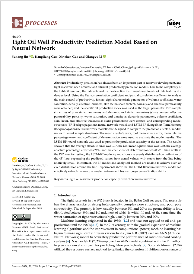 近日,2138cn太阳集团地质学专业2022级研究生金宇航在SCI三区期刊《Processes》(IF=2.8)发表题为"Tight Oil Well Productivity Prediction Model Based on Neural Network"的研究论文。长江大学2138cn太阳集团为论文第一署名单位,研究生金宇航为论文第一作者,其导师郭康良教授为通讯作者。