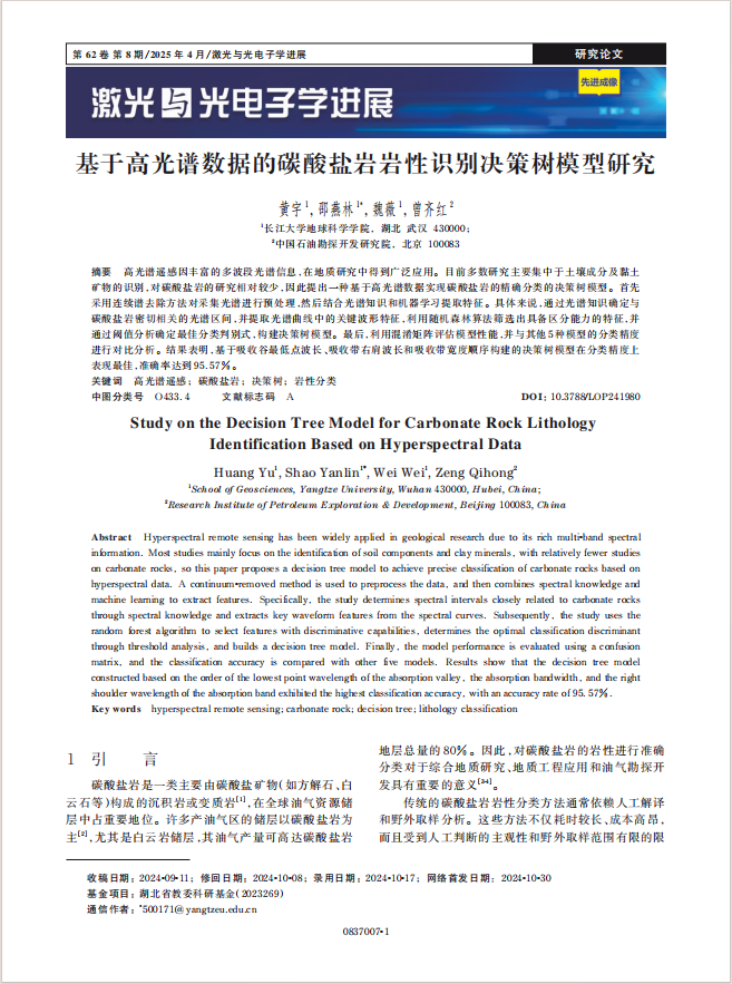 2138cn太阳集团邵燕林副教授团队长期从事数字露头、储层三维表征等方面的研究,团队硕士生黄宇在EI期刊《激光与光电子学进展》上发表题为《基于高光谱数据的碳酸盐岩岩性识别决策树模型》的研究论文。长江大学2138cn太阳集团为论文第一署名单位,硕士生黄宇为论文第一作者,邵燕林副教授为该文通讯作者,本项研究得到湖北省教委科研基金共同资助。