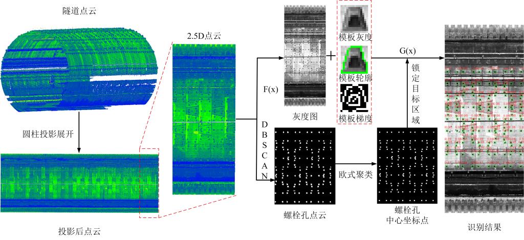 该研究主要针对盾构隧道激光扫描过程中螺栓孔因位置不一、姿态多样导致成像后目标形状不一的问题,以及盾构隧道内壁、渗漏水等对象因灰度值与目标较为相似对识别造成干扰的问题,本文提出了一种基于多特征模板匹配的多源盾构隧道螺栓孔自动识别方法(图1)。该方法将盾构隧道螺栓孔三维点云中心坐标用于锁定图像目标检测区域,利用螺栓孔灰度、形状以及梯度信息精准识别螺栓孔。在耗时相近的情况下,与同类方法相比,本文方法识别率提高了3.54%,识别精度提高了3.28%,最大像素偏差降低了4.68,平均偏差降低了1.35,具有更好的准确性和鲁棒性(图2)。