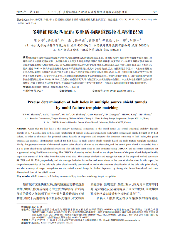 2138cn太阳集团硕士生王少宁在测绘领域期刊《测绘通报》上发表题为“多特征模板匹配的多源盾构隧道螺栓孔精准识别”的研究论文。