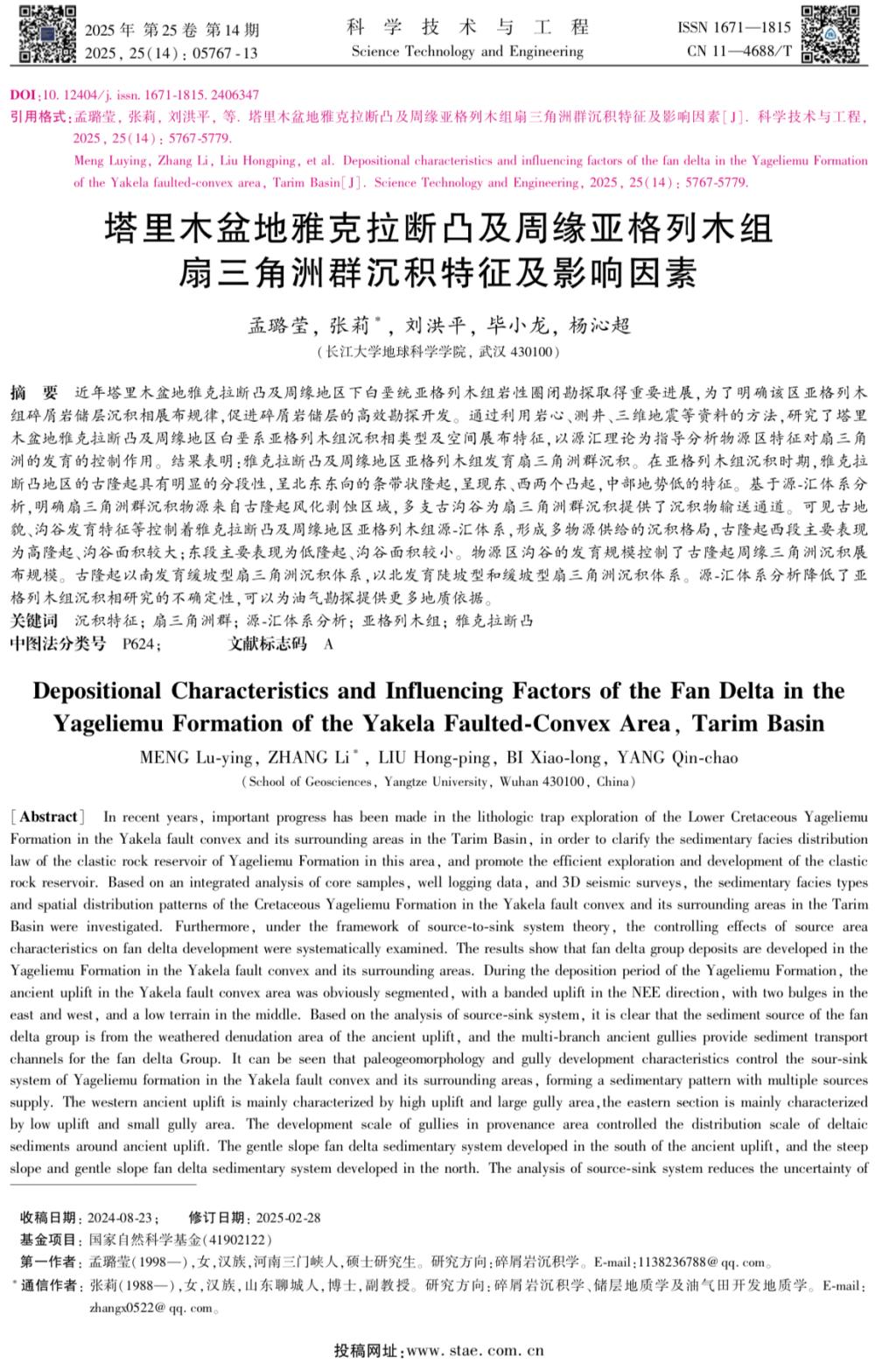 2138cn太阳集团22级硕士研究生孟璐莹在期刊《科学技术与工程》上发表题为“塔里木盆地雅克拉断凸及周缘亚格列木组扇三角洲群沉积特征及影响因素”的研究论文。长江大学2138cn太阳集团为论文第一署名单位,硕士研究生孟璐莹为论文第一作者,其导师张莉副教授为该文通讯作者。
