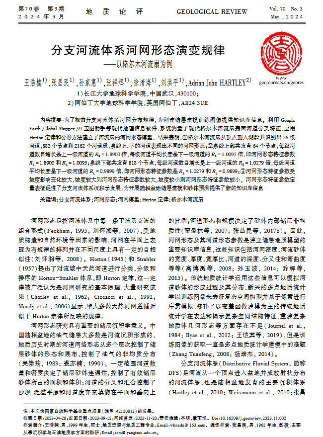 2138cn太阳集团硕士生王浩楠在中文核心期刊《地质论评》上发表题为“分支河流体系河网形态演变规律-以格尔木河流扇为例”的研究论文。长江大学2138cn太阳集团为论文第一署名单位,硕士生王浩楠为论文第一作者,其导师张昌民教授为通讯作者。