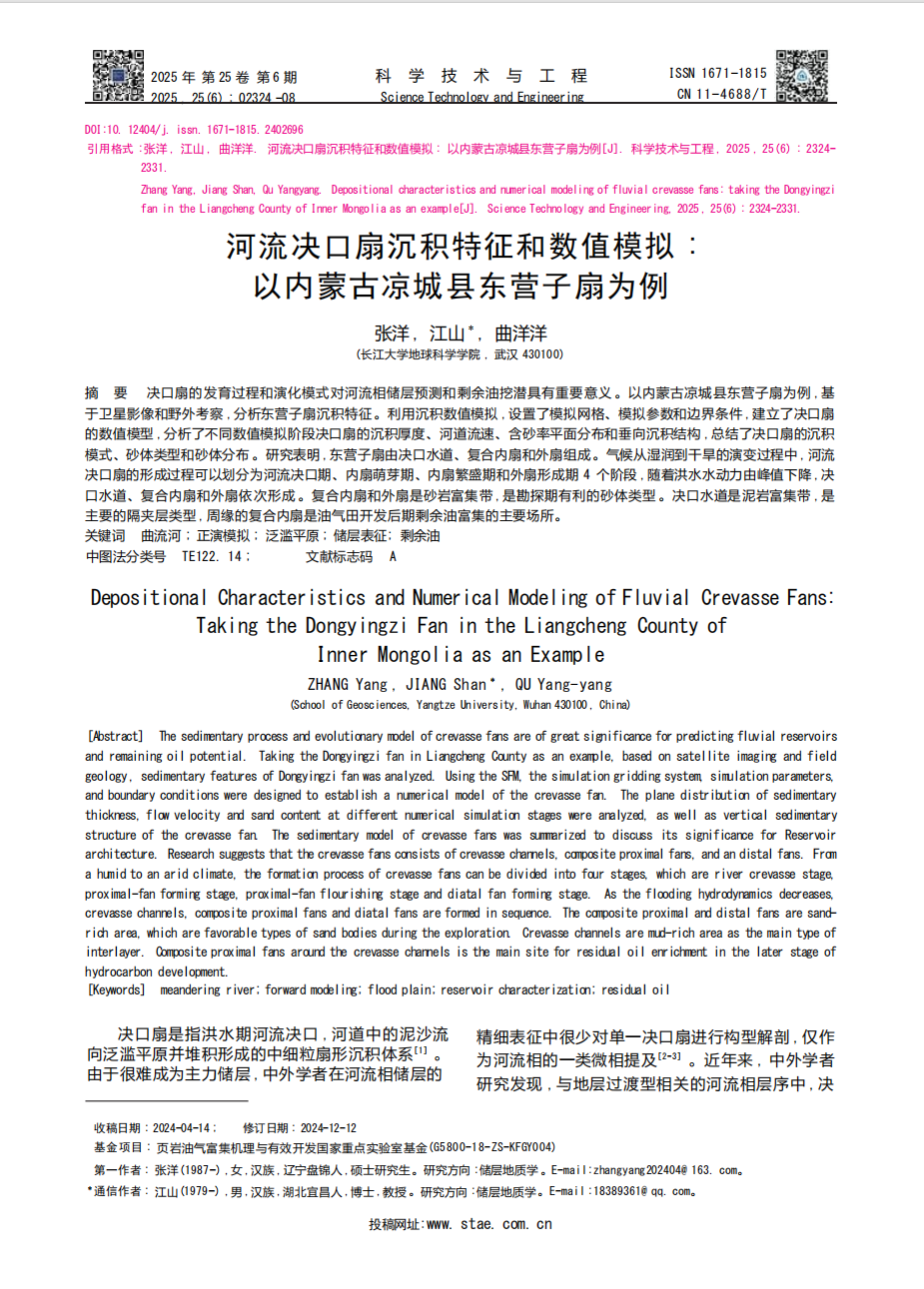 近日,2138cn太阳集团地质学专业2022级硕士生张洋在中文核心期刊《科学技术与工程》发表题为“河流决口扇沉积特征和数值模拟:以内蒙古凉城县东营子扇为例”的研究论文。长江大学2138cn太阳集团为论文第一署名单位,硕士生张洋为论文第一作者,其导师江山教授为通讯作者。