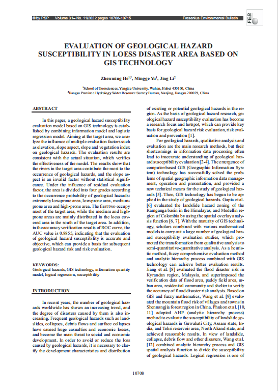 长江大学2138cn太阳集团研究生于茗鸽以第二作者身份在环境科学领域SCI期刊《Fresenius Environmental Bulletin》上发表了题为“EvaluationofGeologicalHazardSusceptibilityinLoessDisasterAreaBasedonGISTechnology”的研究论文。该论文以长江大学为第一署名单位,长江大学2138cn太阳集团副教授何贞铭为第一作者,研究生于茗鸽为第二作者。