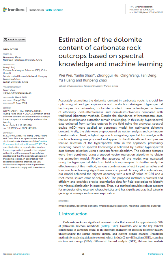 2138cn太阳集团魏薇博士在国际学术期刊《Frontiers in Earth Science》上发表了题为“Estimation of the Dolomite Content of Carbonate Rock Outcrops Based on Spectral Knowledge and Machine Learning”的SCI论文,提出了一种融合光谱知识与机器学习的白云石含量预测方法,为碳酸盐岩矿物成分的快速定量分析提供了新的技术手段。