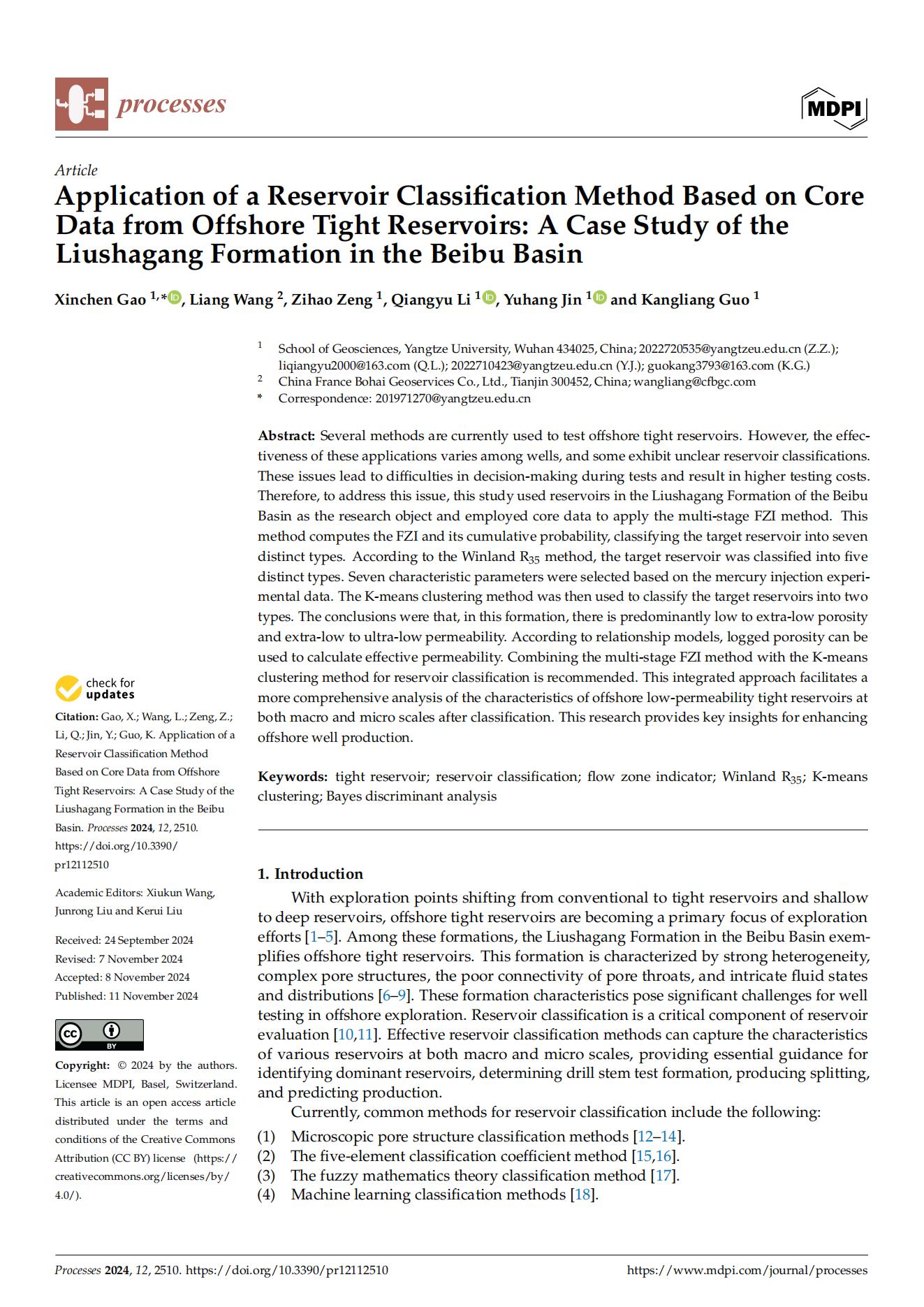 2138cn太阳集团22级博士研究生在期刊《Processes》上发表题为“Application of a Reservoir Classification Method Based on CoreData from Offshore Tight Reservoirs: A Case Study of theLiushagang Formation in the Beibu Basin”的研究论文。长江大学2138cn太阳集团为论文第一署名单位,高昕晨为第一通讯作者。
