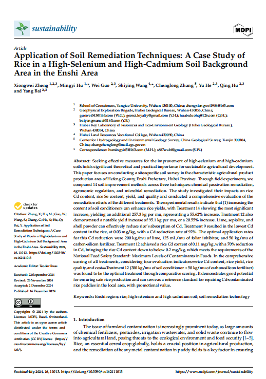 2138cn太阳集团博士生郑雄伟在《Sustainability》上发表题为《Application of Soil Remediation Techniques: A Case Study ofRice in a High-Selenium and High-Cadmium Soil BackgroundArea in the Enshi Area》的研究论文。长江大学2138cn太阳集团为论文第一署名单位,博士生郑雄伟为论文第一作者,教师胡明毅为通讯作者。