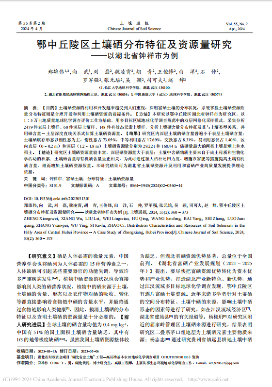 2138cn太阳集团博士生郑雄伟在《土壤通报》上发表题为“鄂中丘陵区土壤硒分布特征及资源量研究−以湖北省钟祥市为例”的研究论文。该论文选取鄂中丘陵区湖北省钟祥市西北部地区为研究对象,采用多目标区域地球化学调查规范中所采用的双层网格化模式采样,测定包括硒在内的土壤各类元素等30项指标,通过单位土壤硒含量揭示土壤硒的分布特征、硒的来源及影响因素,对湖北省土壤硒资源开发利用和富硒产业高质量发展有着重要的实际意义。