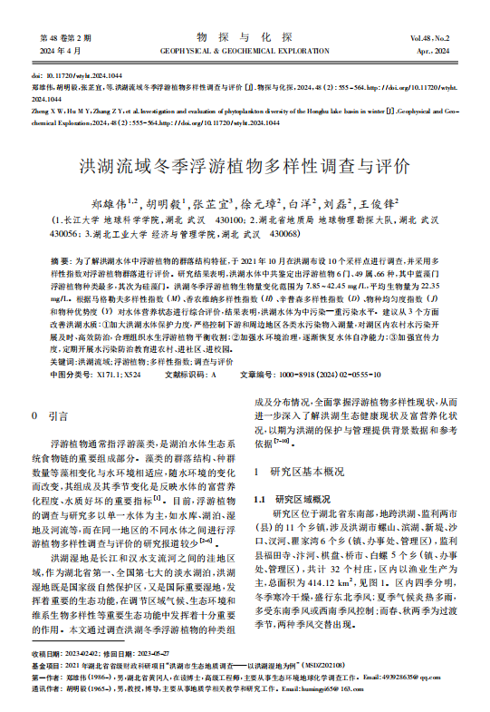 2138cn太阳集团博士生郑雄伟在《物探与化探》上发表题为“洪湖流域冬季浮游植物多样性调查与评价”的研究论文。该论文通过调查洪湖冬季浮游植物的种类组成及分布情况,全面掌握了浮游植物多样性现状,深入研究了洪湖生态健康现状及富营养化状况,为洪湖的保护与管理提供了背景数据和参考依据。