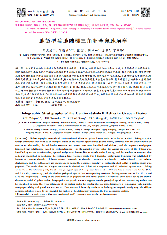 长江大学2138cn太阳集团邹志友博士联合研究团队,在《科学技术与工程》期刊上发表了题为“地堑型盆地陆棚三角洲全息地层学”的研究文章。该研究聚焦于地堑型盆地陆棚三角洲的全息地层学特征,主要研究内容及成果如下: