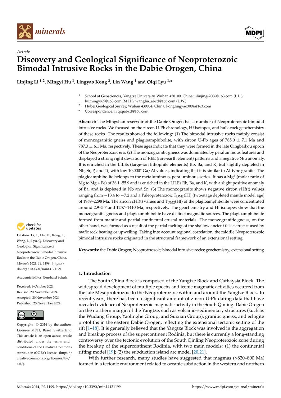2138cn太阳集团地质系胡明毅教授团队长期从事地质学方向的研究。团队成员李琳静博士在期刊《Minerals》上发表题为《Discovery and Geological Significance of NeoproterozoicBimodal Intrusive Rocks in the Dabie Orogen, China》的研究论文,长江大学2138cn太阳集团为论文第一署名单位,博士生李琳静为论文第一作者。