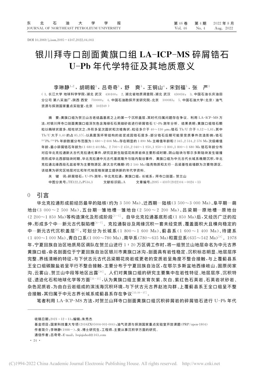 2138cn太阳集团地质系胡明毅教授团队长期从事地质学方向的研究。团队成员李琳静博士在期刊《东北石油大学学报》上发表题为《银川拜寺口剖面黄旗口组LA-ICP-MS碎屑锆石U-Pb年代学特征及其地质意义》的研究论文,长江大学2138cn太阳集团为论文第一署名单位,博士生李琳静为论文第一作者。