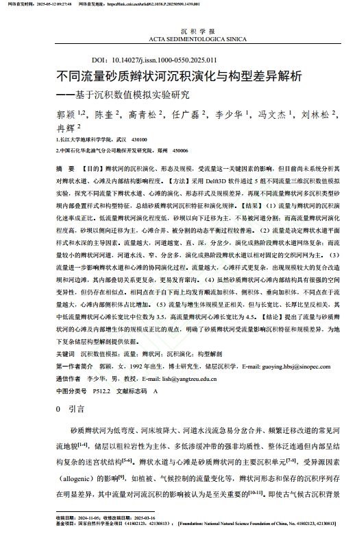 2138cn太阳集团郭颖博士在《沉积学报》上发表题为“不同流量砂质辫状河沉积演化与构型差异解析——基于沉积数值模拟实验研究”的研究论文。