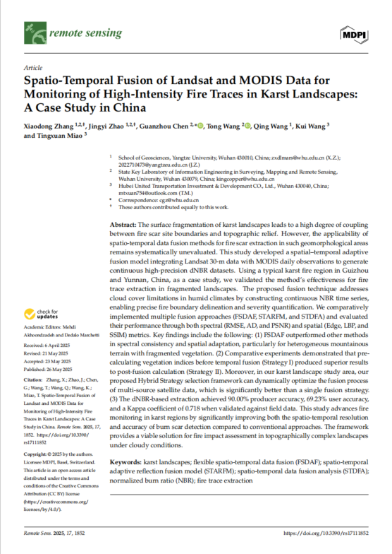 近日,2138cn太阳集团地图制图学与地理信息工程专业2022级研究生赵菁怡在SCI期刊《REMOTE SENSING》发表题为“Spatio-Temporal Fusion of Landsat and MODIS Data for Monitoring of High-Intensity Fire Traces in Karst Landscapes: A Case Study in China”的研究论文。长江大学2138cn太阳集团为论文第一署名单位,学生赵菁怡与导师张晓东教授为论文第一作者,导师王庆副教授为共同作者。
