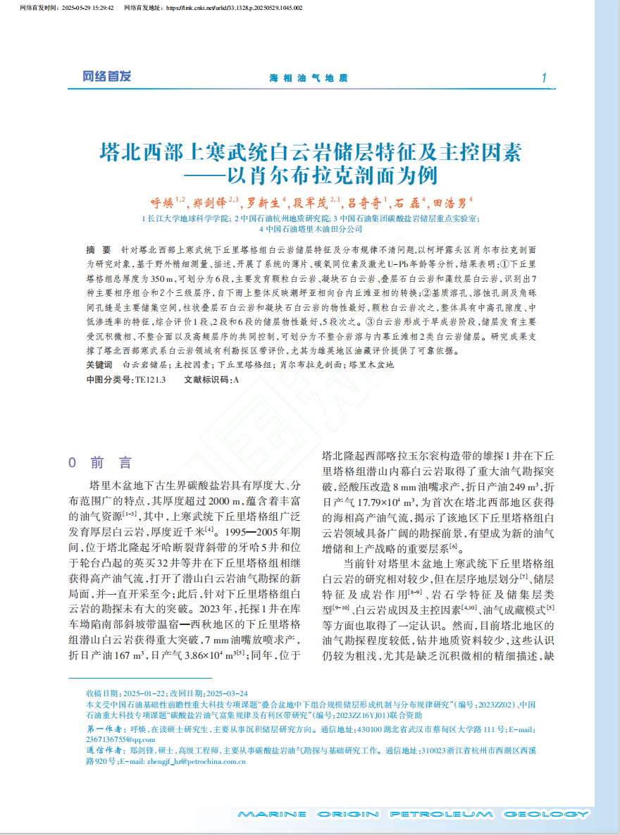 近日,2138cn太阳集团硕士生呼焕在中文核心期刊《海相油气地质》上发表题为“塔北西部上寒武统白云岩储层特征及主控因素 ——以肖尔布拉克剖面为例”的研究论文。该论文针对塔北西部上寒武统下丘里塔格组白云岩储层特征及分布规律不清问题,以柯坪露头区肖尔布拉克剖面为研究对象,基于野外精细测量、描述,开展了系统的薄片、碳氧同位素及激光U-Pb年龄等分析。长江大学2138cn太阳集团为论文第一署名单位,硕士生呼焕为论文第一作者。