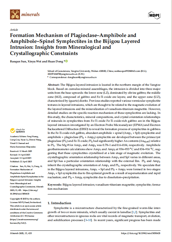 2138cn太阳集团硕士生孙保群在SCI收录期刊《minerals》上发表题为“Formation Mechanism of Plagioclase–Amphibole and Amphibole–Spinel Symplectites in the Bijigou Layered Intrusion: Insights from Mineralogical and Crystallographic Constraints”的研究论文。长江大学2138cn太阳集团为论文第一署名单位,董欢副教授为第一通讯作者,论文由中国青年基金国家自然科学基金项目资助。