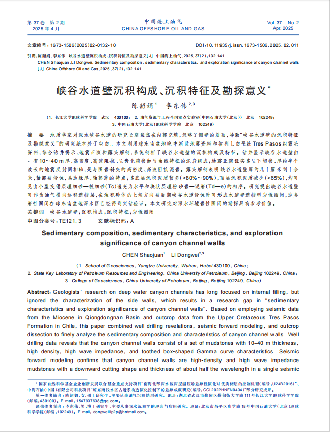 2138cn太阳集团硕士生陈韶娟在期刊《中国海上油气》上发表了题为“峡谷水道壁的沉积特征、沉积模式及勘探意义”的研究论文。长江大学2138cn太阳集团为论文第一署名单位,陈韶娟为第一作者。