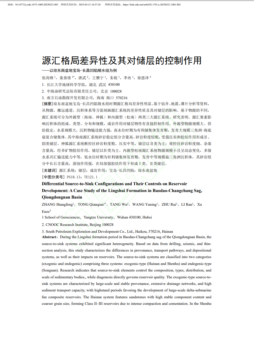 2138cn太阳集团地质学专业硕士生童茜倩在《长江大学学报(自然科学版)》发表题为《源汇格局差异性及其对储层的控制作用——以琼东南盆地宝岛-长昌凹陷陵水组为例》的研究论文,长江大学2138cn太阳集团为论文第一署名单位,其导师张尚锋教授为第一作者,童茜倩为共同第一作者。