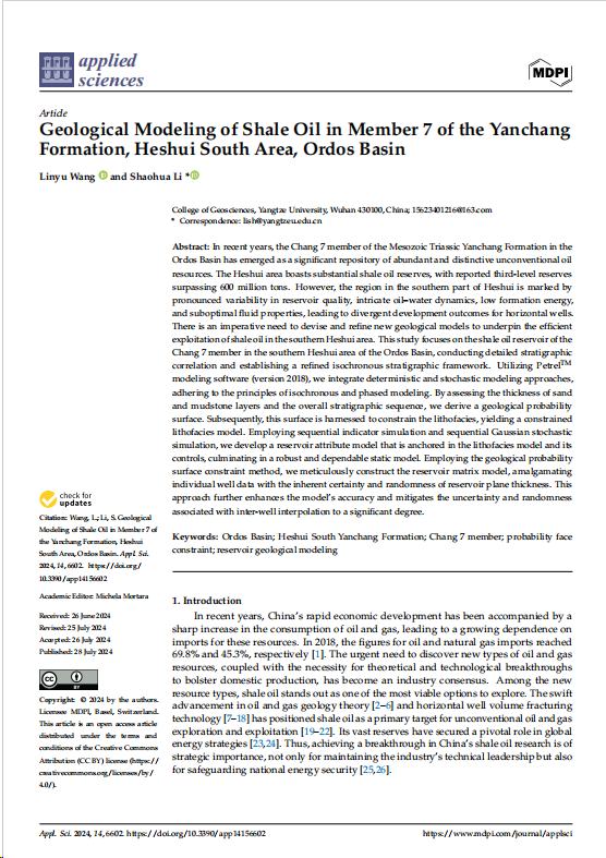 2138cn太阳集团李少华教授团队长期从事储层表征与建模的研究,团队成员王麟宇在环境与地球科学领域主流期刊《Applied Sciences》上发表题为“Geological Modeling of Shale Oil in Member 7 of the YanchangFormation,Heshui South Area, Ordos Basin”的研究论文。
