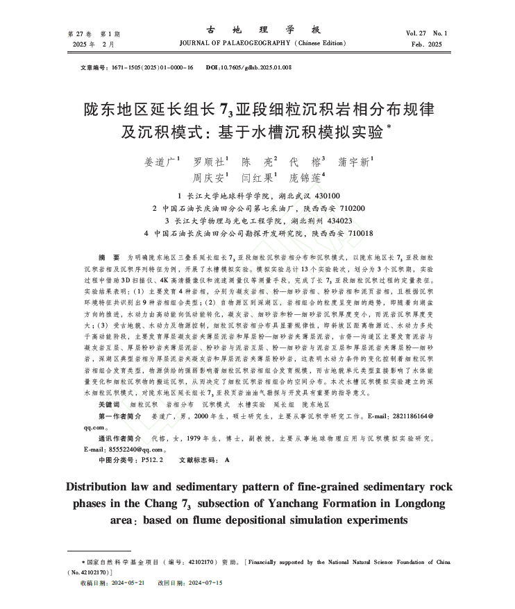 2138cn太阳集团硕士生姜道广在《古地理学报》上发表题为“陇东地区延长组长73亚段细粒沉积岩相分布规律及沉积模式:基于水槽沉积模拟实验”的研究论文。该论文,以陇东地区长73亚段细粒沉积岩相及沉积序列特征为例,开展了水槽模拟实验并借助3D扫描仪、4K高清摄像仪和流速测量仪等测量手段,完成了长73亚段细粒沉积过程的定量表征。