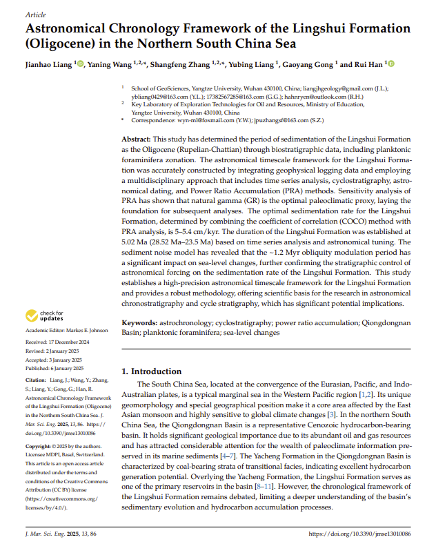 2138cn太阳集团地质学专业硕士研究生梁建昊在中科院二区期刊《Journal of Marine Science and Engineering》(IF=2.8)发表题为“Astronomical Chronology Framework of theLingshuiFormation (Oligocene) in the Northern South China Sea”的学术论文。长江大学2138cn太阳集团为第一署名单位,王雅宁副教授和张尚锋教授担任通讯作者,研究获得国家自然科学基金资助。