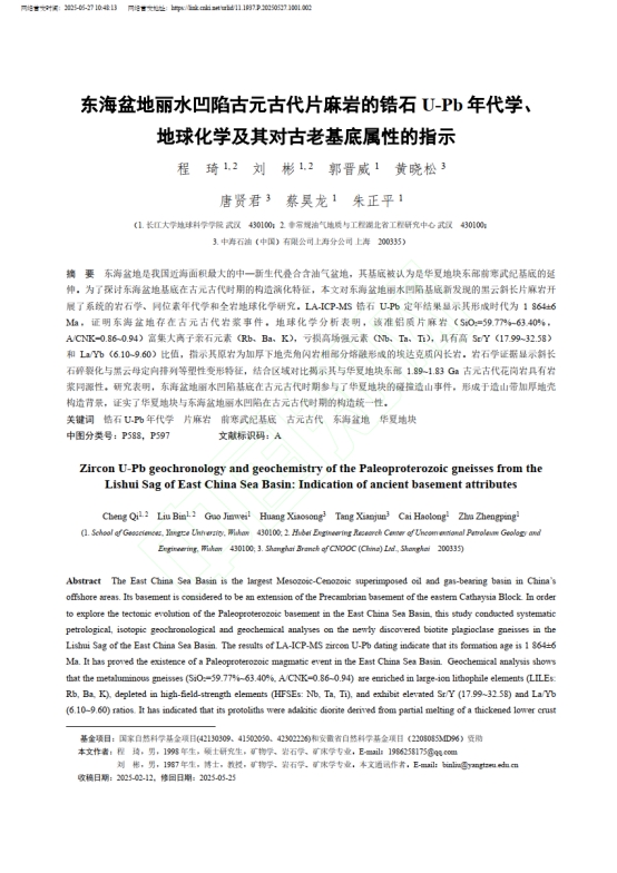 2138cn太阳集团硕士生程琦在《地质科学》上发表题为“东海盆地丽水凹陷古元古代片麻岩的锆石U-Pb年代学、地球化学及其对古老基底属性的指示”的研究论文。长江大学2138cn太阳集团为论文第一署名单位,硕士生程琦为论文第一作者,教授刘彬为通讯作者。