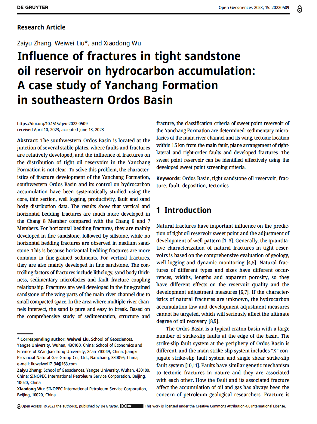 2138cn太阳集团硕士生张在玉在SCI收录期刊《Open Geosciences》上发表题为“Influence of fractures in tightsandstoneoil reservoir on hydrocarbon accumulation: A case study of Yanchang Formation in southeastern Ordos Basin”的研究论文,长江大学2138cn太阳集团为论文第一署名单位,硕士生张在玉为论文第一作者,指导老师刘伟伟为通讯作者。
