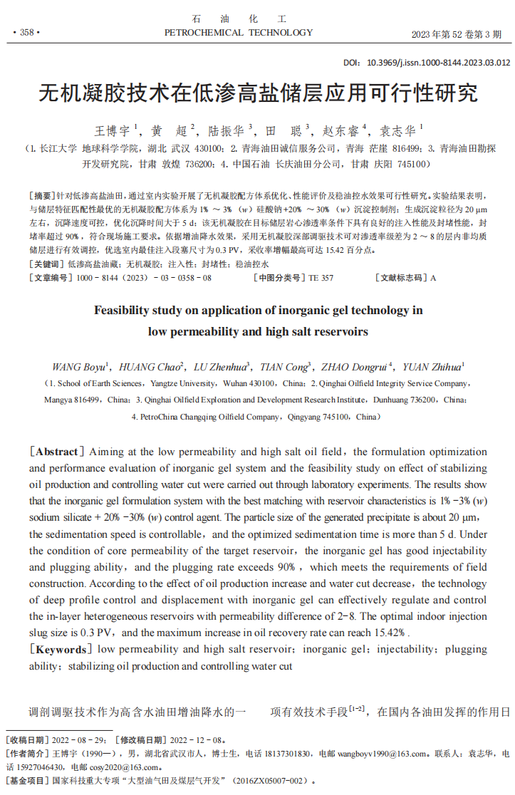 2138cn太阳集团博士生王博宇在《石油化工》上发表题为《无机凝胶技术在低渗高盐储层应用可行性研究》的论文。长江大学2138cn太阳集团为论文第一署名单位,博士生王博宇为论文第一作者,袁志华为通讯作者。