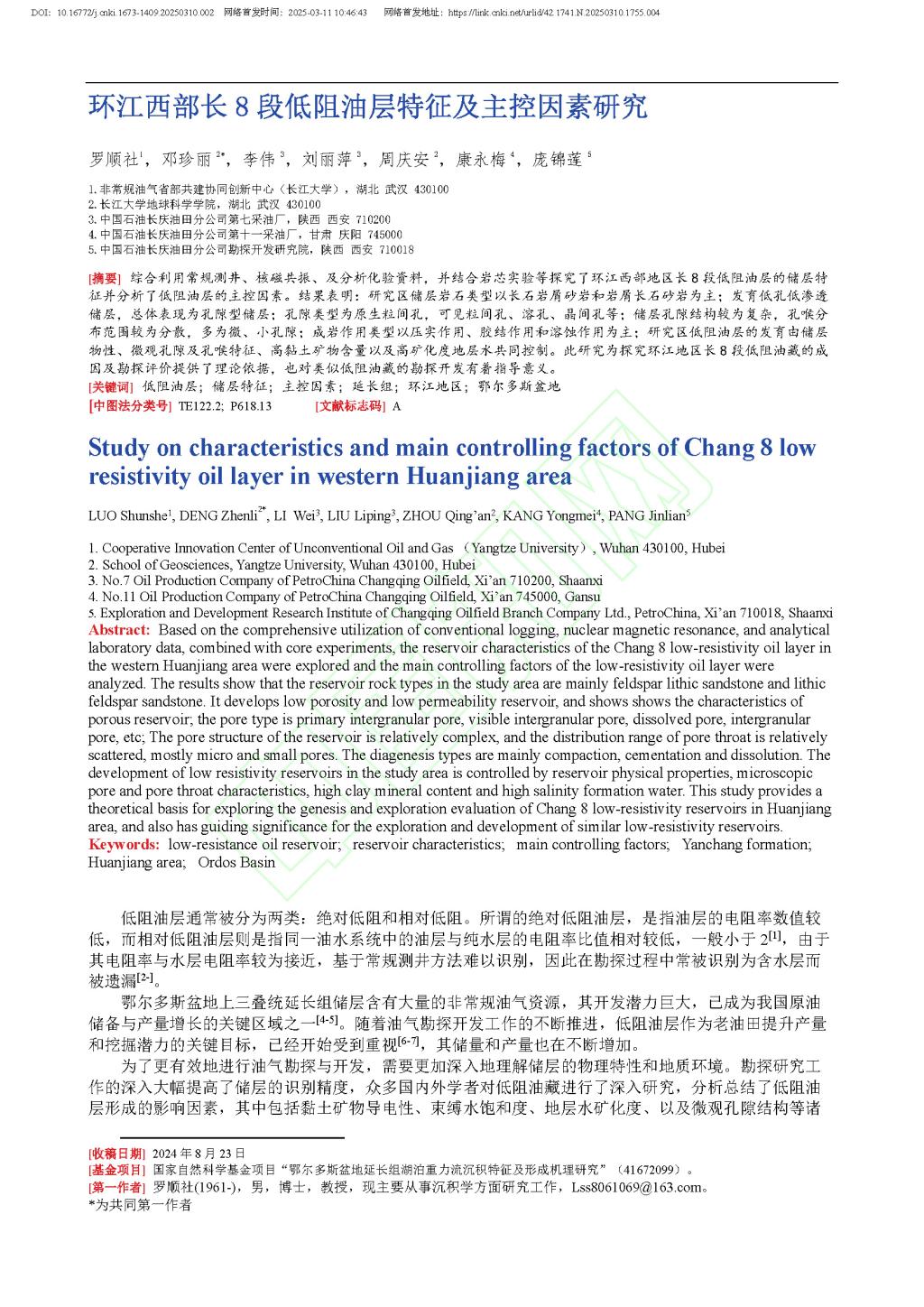 2138cn太阳集团硕士生邓珍丽在长江大学学报(自然科学版)发表题目为“环江西部长8段低阻油层特征及主控因素研究”的研究论文。长江大学2138cn太阳集团为论文第一署名单位,为论文第一作者,导师罗顺社为第一作者,硕士研究生邓珍丽为论文通讯作者。