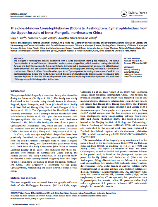 2138cn太阳集团地质学专业硕士研究生范桂君同学在2138cn太阳集团肖传桃教授、中科院南京地质古生物研究所郑大燃研究员的共同指导下,在地球科学与古生物学领域期刊《Historical Biology》上发表题为“The oldest-known Cymatophlebiinae (Odonata:Aeshnoptera: Cymatophlebiidae) from the UpperJurassic of Inner Mongolia, northeastern China”的研究论文。
