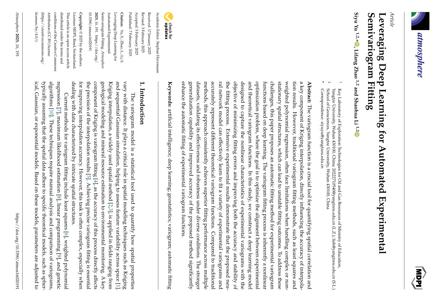 2138cn太阳集团硕士研究生赵丽芳在《Atmosphere》上发表题为“Leveraging Deep Learning for Automated Experimental Semivariogram Fitting”的论文,长江大学2138cn太阳集团为论文第一署名单位,研究生赵丽芳为第二作者,其导师喻思羽副教授为该论文的第一作者和通讯作者。