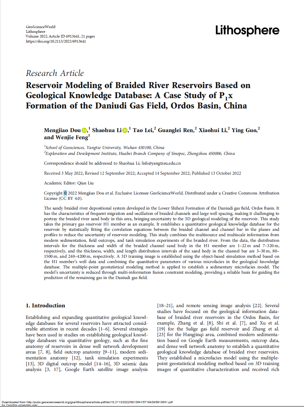 2138cn太阳集团博士生窦梦皎在《Lithosphere》上发表题为“Reservoir Modeling of Braided River Reservoirs Based onGeological Knowledge Database: A Case Study of P1xFormation of the Daniudi Gas Field, Ordos Basin, China”的研究论文。长江大学2138cn太阳集团为论文第一署名单位,博士生窦梦皎为论文第一作者,其导师李少华为通讯作者。