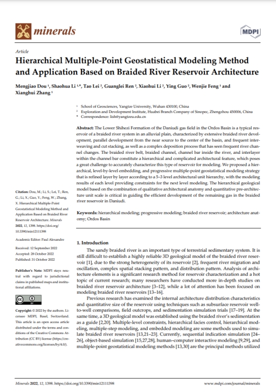 2138cn太阳集团博士生窦梦皎在《Minerals》上发表题为“Hierarchical Multiple-Point Geostatistical Modeling MethodAndApplication BasedOnBraided River ReservoirArchitecture”的研究论文。长江大学2138cn太阳集团为论文第一署名单位,博士生窦梦皎为论文第一作者,其导师李少华为通讯作者。