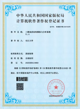 长江大学2138cn太阳集团硕士生吴栩璇开发的软件《三维地质结构模拟与分析系统》取得了软件著作权并进行成果转化。长江大学为第一申请人,硕士研究生吴栩璇为第一发明人。