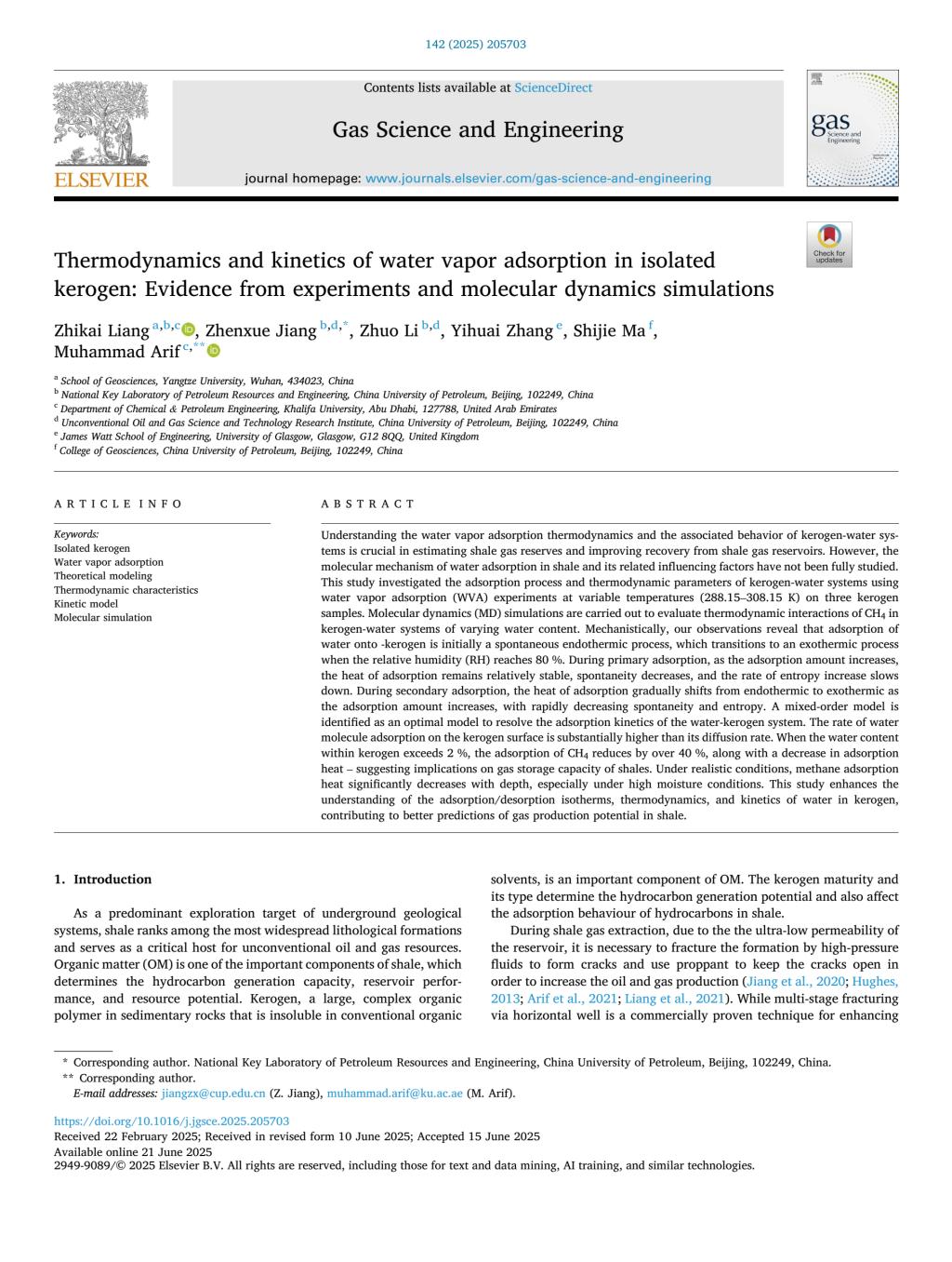 2138cn太阳集团石油系梁志凯特任副教授以第一作者身份在《Gas Science and Engineering》上发表题为“Thermodynamics and kinetics of water vapor adsorption in isolated kerogen: Evidence from experiments and molecular dynamics simulations”的研究论文,长江大学2138cn太阳集团为论文第一署名单位。