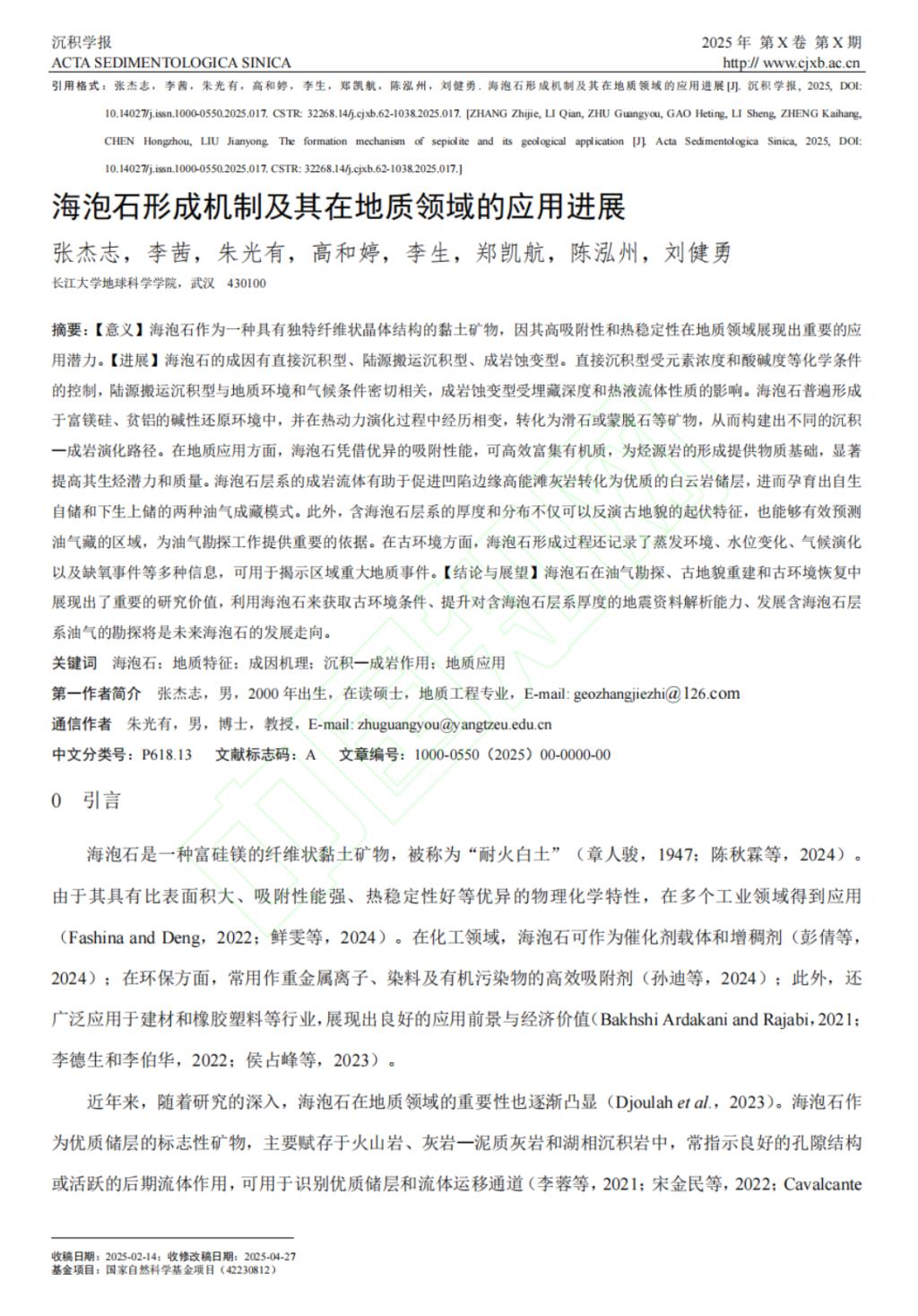 近日,2138cn太阳集团24级研究生张杰志在核心期刊《沉积学报》上发表了题为《海泡石形成机制及其在地质领域的应用进展》的论文(共32页)。全部作者均来自长江大学2138cn太阳集团师生,研究生张杰志为论文第一作者,其导师朱光有教授为通信作者。论文重点讨论了海泡石的地质特征、成因机制、沉积—成岩的关系以及在地质领域的应用。