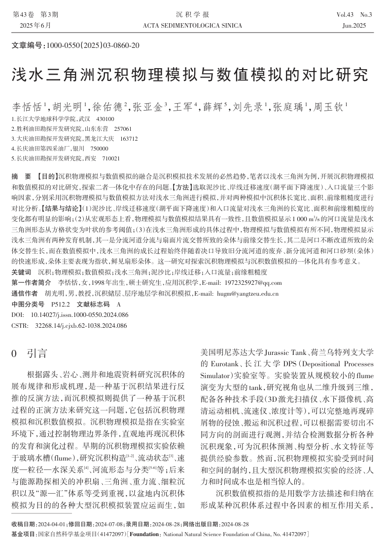 近日,2138cn太阳集团2020级研究生李恬恬在核心期刊《沉积学报》上发表了题为《浅水三角洲沉积物理模拟与数值模拟的对比研究》的论文(共20页)。研究生李恬恬为论文第一作者,其导师胡光明教授为通信作者。论文重点讨论了浅水三角洲发育的控制因素、沉积演化规律、形态展布特征等,比较物理模拟和数值模拟结果的相似性。
