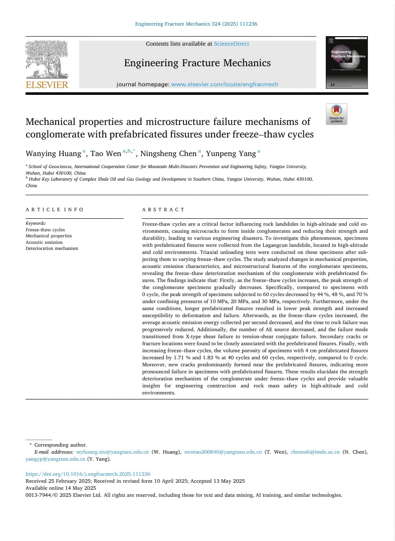 2138cn太阳集团2023级研究生黄婉滢在中科院大类2区SCI期刊《Engineering Fracture Mechanics》上发表题为“Mechanical properties and microstructure failure mechanisms of conglomerate with prefabricated fissures under freeze–thaw cycles”的研究论文(图1)。长江大学2138cn太阳集团为论文第一署名单位,硕士研究生黄婉滢为论文第一作者,其导师温韬教授为通讯作者。