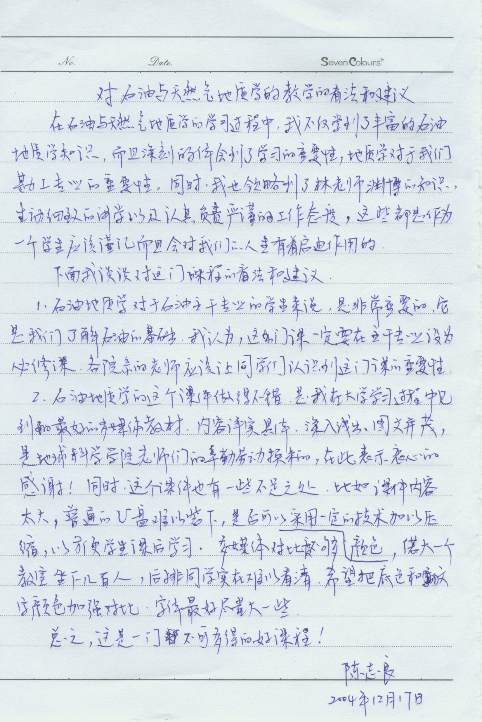 该课程近五年学生及同行对主讲教师讲课的评估值高出全校平均值,在全校教师排名中位居前列。学生对教师课堂教学评估分近五年平均为91.8。该课程作为矿产普查与勘探专业研究生入学考试的必考课程,学生参加研究生入学考试时成绩以及用人单位的反馈意见证明课程教学质量是优秀的。近五年本科生参加硕士研究生考试中,《石油地质学》专业课成绩平均优良,考研上线率高,资源勘查工程专业2001届学生考研上线率达43.3%;2002届学生考研上线率达64%;2003届学生考研上线率达53%;2004届学生考研上线率达50%; 2005届学生考研上线率达49%。学生报考的院校包括北京大学、石油大学、中国地质大学、同济大学、中国科学院、中国石油勘探开发科学研究院等重点院所。