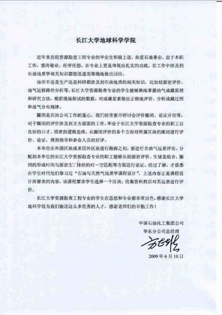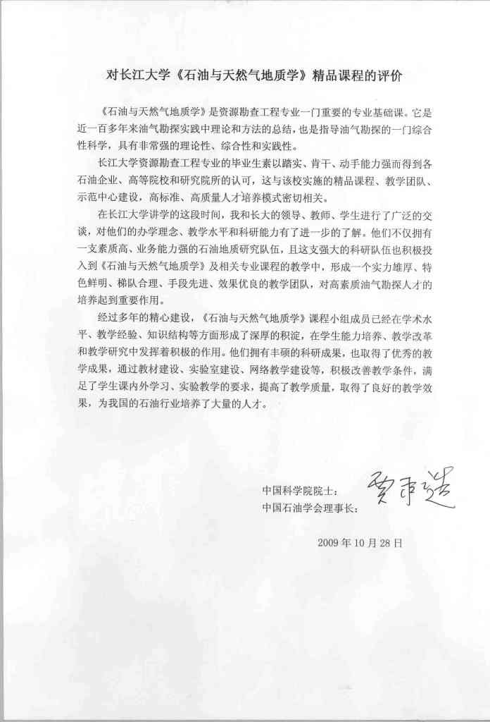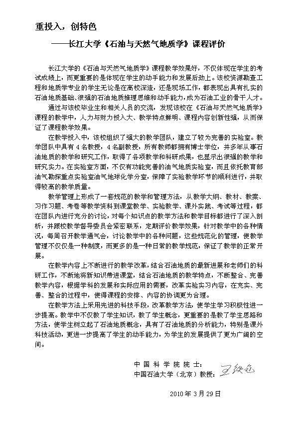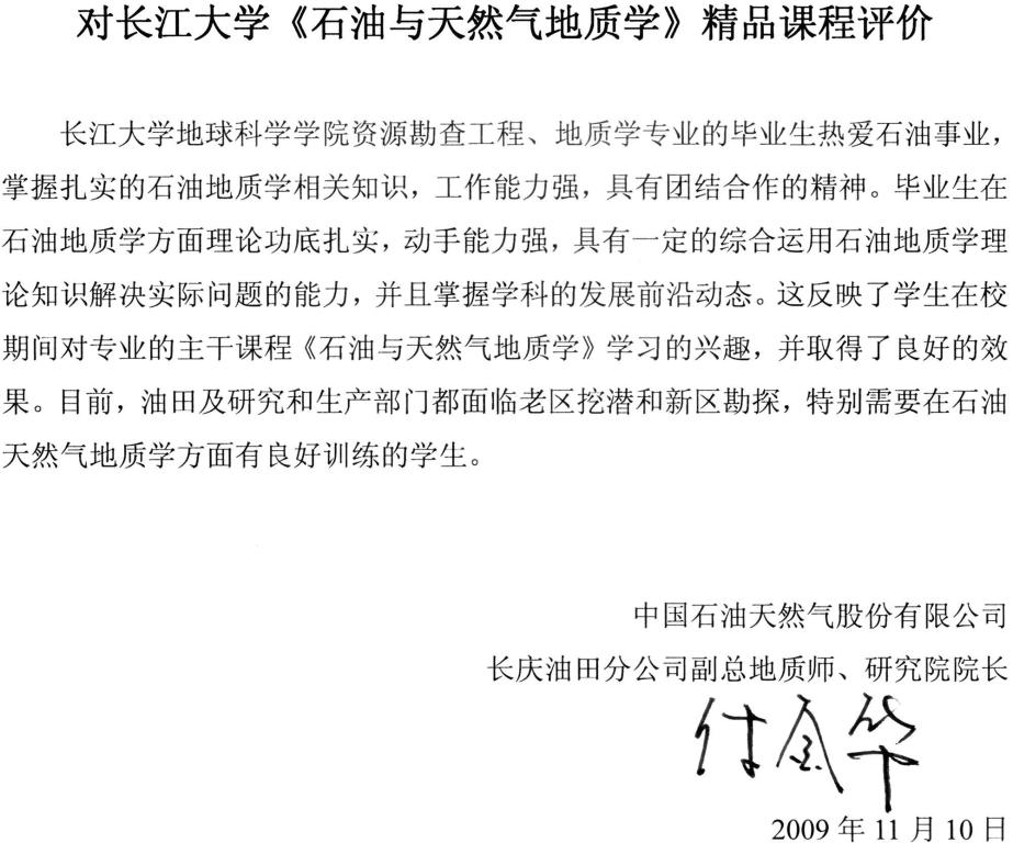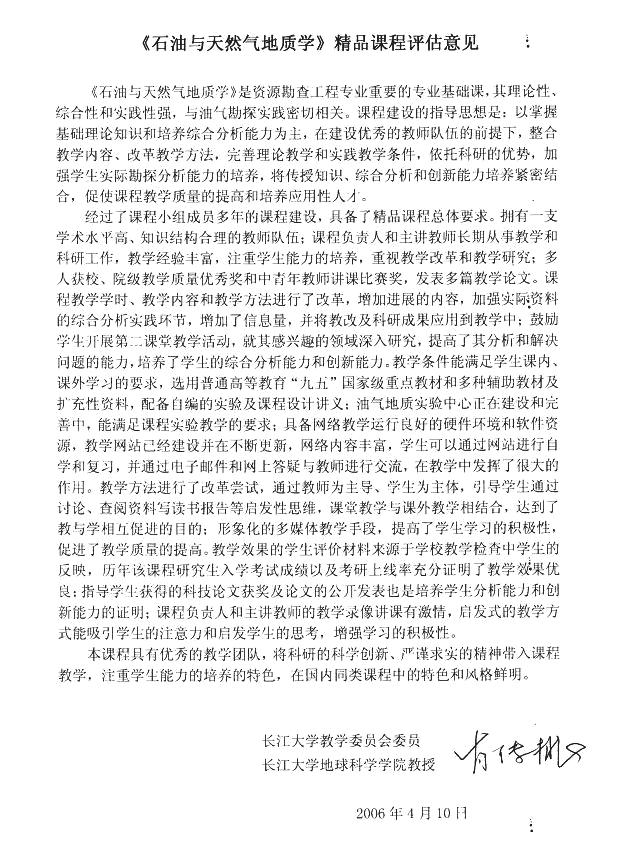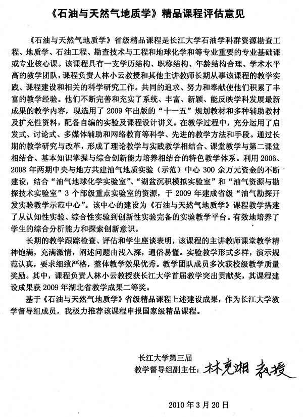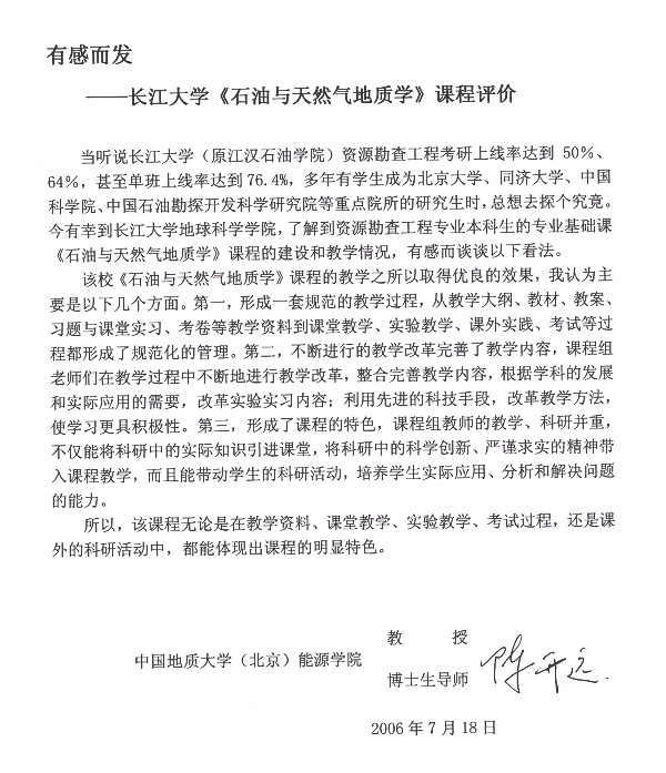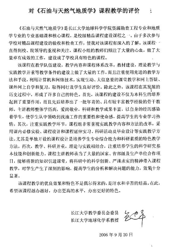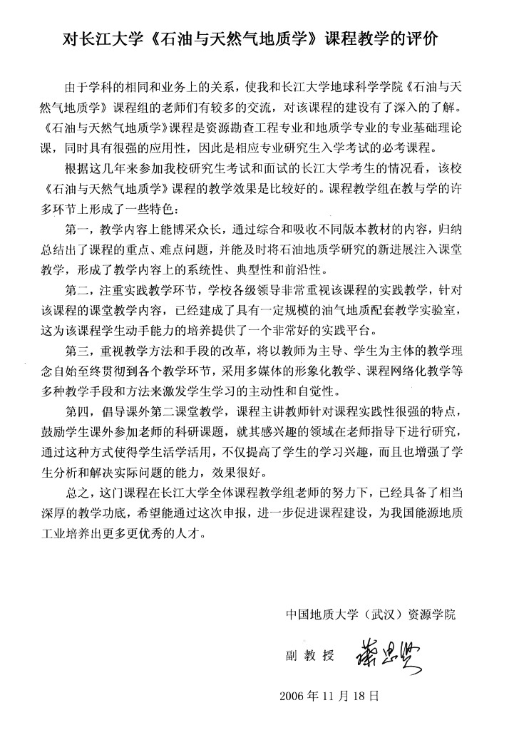 从每年长江大学资源勘查工程专业较高的考研上线率和专业课的成绩反映,该校《石油与天然气地质学》课程的教学取得良好的效果。我为该校《石油与天然气地质学》课程有这样的成绩高兴,这是领导、老师们辛勤劳动的结晶,也是我们国家石油事业的骄傲。